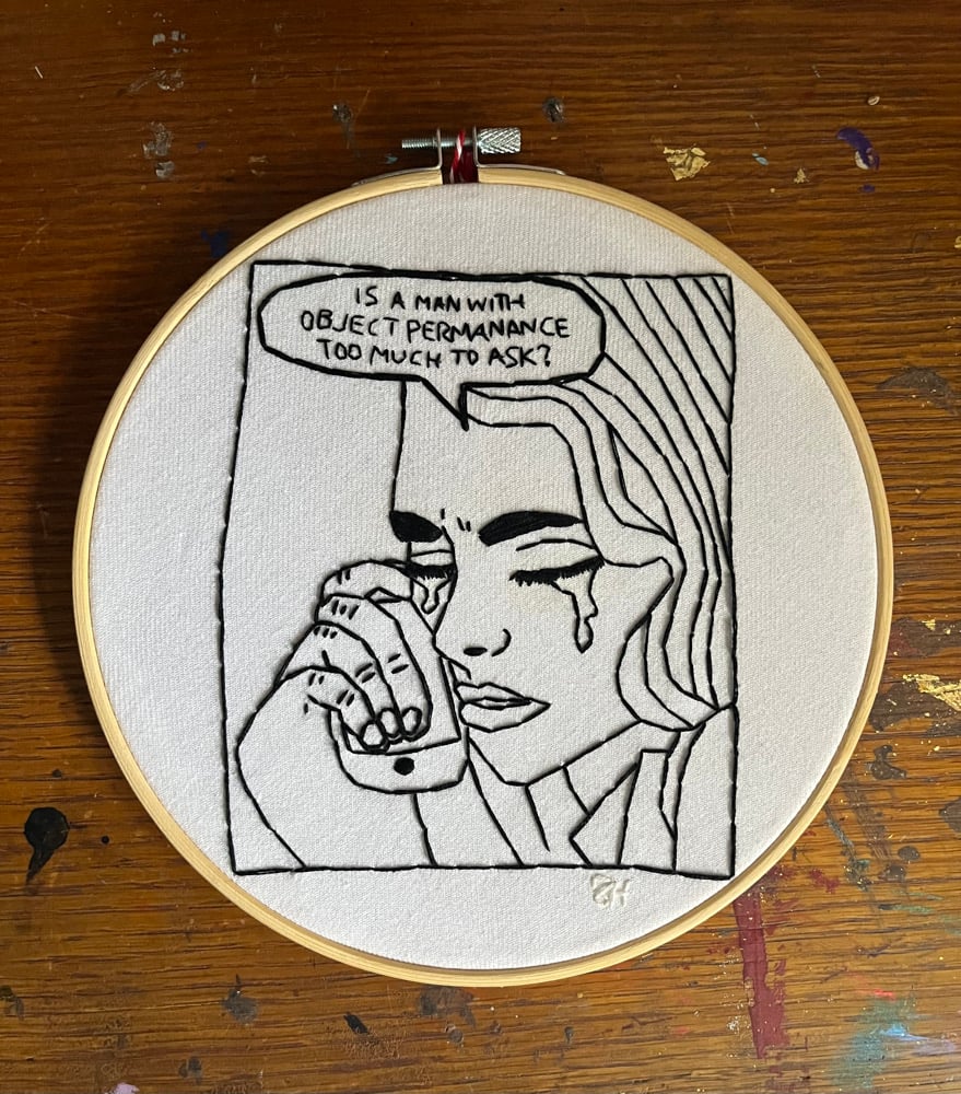 A 8” hoop with a semi autobiographical design I’ve stitched a few times since 2021.