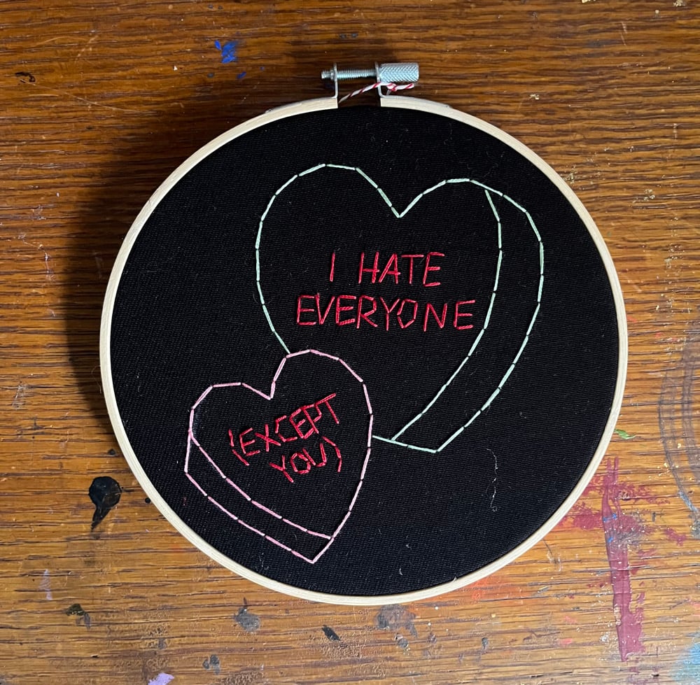 A 7” wooden embroidery hoop with two stitched candy hearts.