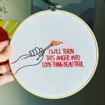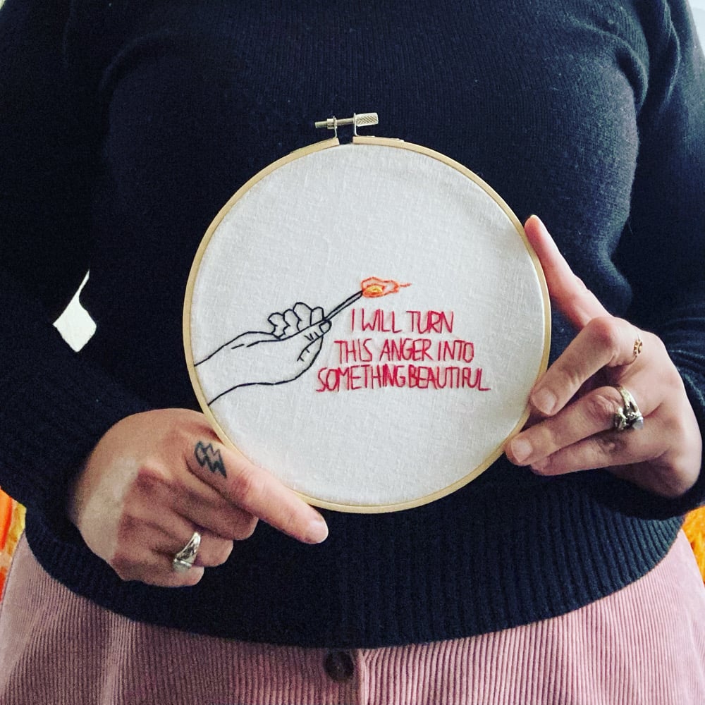 One of my favorite things I make, a 8” embroidery hoop with the words “I make turn this anger into something beautiful” and a hand holding a lit match stitched on white linen. This hoop is made to order and will take 2-3 weeks. It comes ready to hang.
